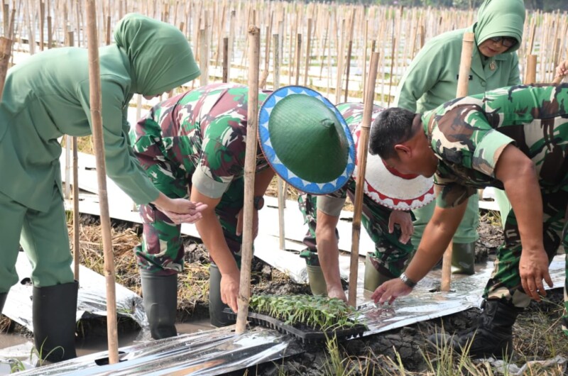 Madiun, – Danrem 081/DSJ, Kolonel Inf Rama Pratama dan Ketua Persit Koorcab Rem 081 PD V/Brawijaya, Ny. Dhina Rama Pratama melakukan tanam melon di area persawahan Desa Tanjungrejo, Kabupaten Madiun.