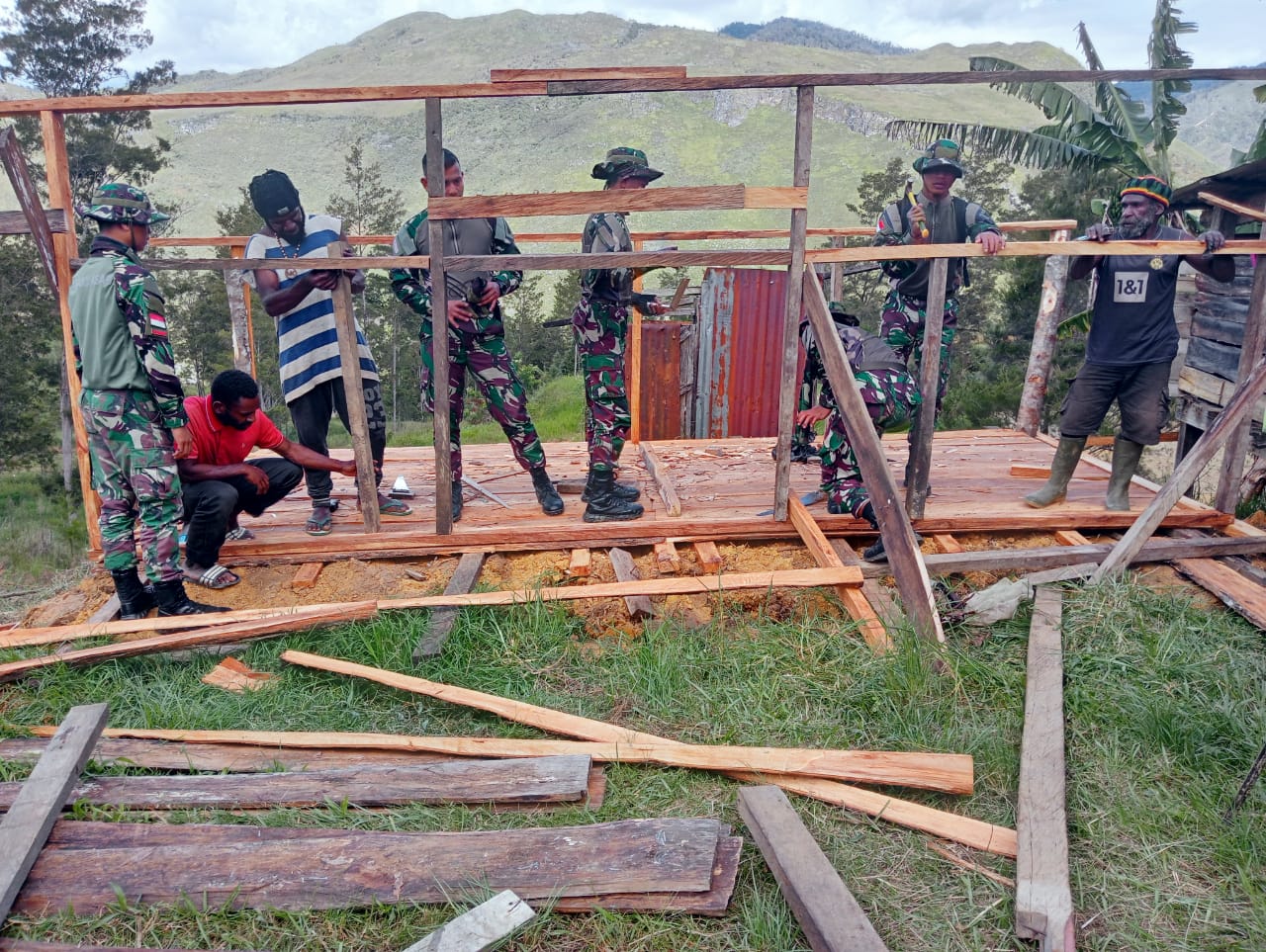 Seperti yang dilakukan oleh Satgas Yonif 721/Mks Pos Kotis Tiom dalam mengamalkan 8 Wajib TNI, Danpos Kotis Tiom Lettu Inf Rizal bersama 15 personel lainnya bantu perbaiki rumah warga dan membangun kandang ternak warga yang ada di sekitar pos, Desa Ninabua, Distrik Tiom, Kabupaten Lanny Jaya, Papua Pegunungan, Selasa (27/6/2023).
