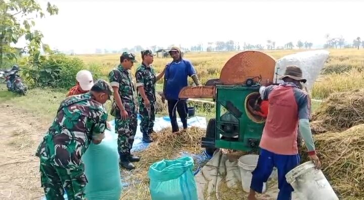 Bersama dua rekannya, Serma Sumartana turun langsung membantu warga memanen padi pada Jumat (3/10/2025). Dengan sigap ia mengoperasikan mesin perontok, mengangkut hasil panen, hingga ikut menjemur gabah di pematang sawah.