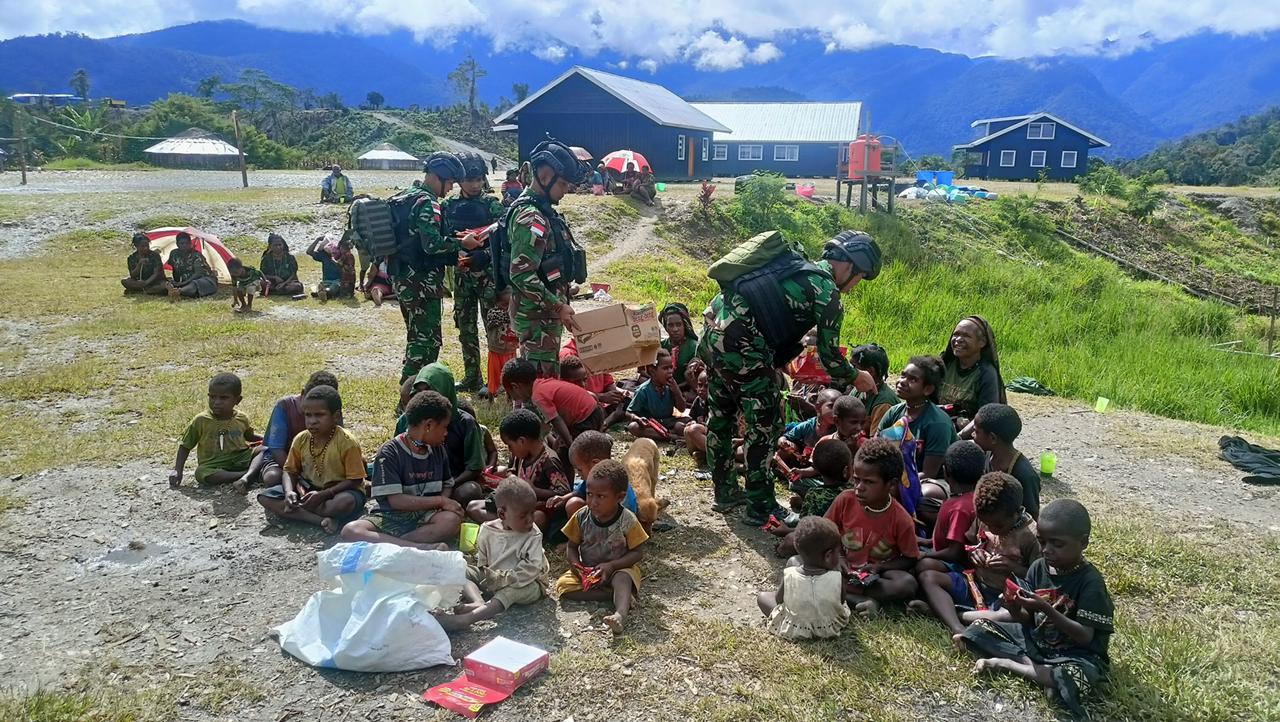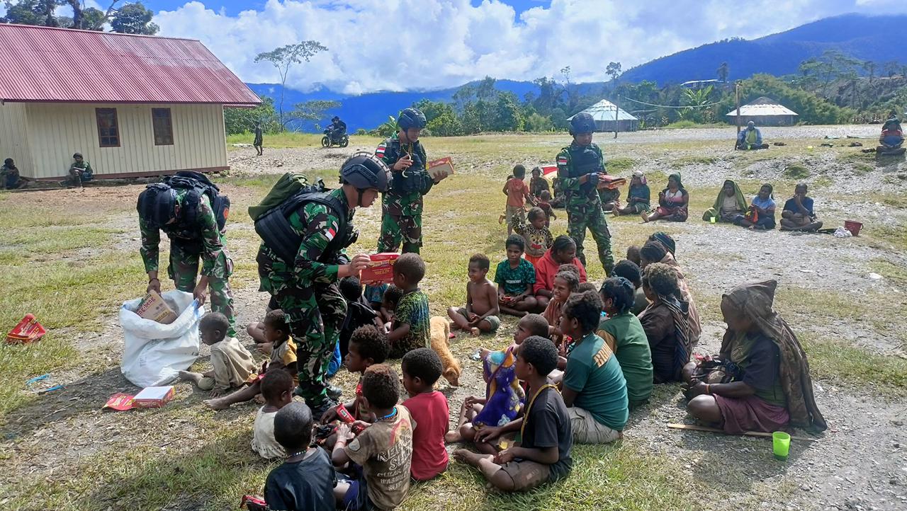 Prajurit TNI Satgas Yonif 115/ML yang rutin melakukan kegiatan anjangsana ke Kampung, kembali mengunjungi Masyarakat sambil membagikan cokelat kepada anak-anak di Kampung Tirineri, Distrik Yambi, Kabupaten Puncak Jaya. Pembagian cokelat tersebut dilakukan oleh personel Satgas Yonif 115/ML dari Pos Tirineri yang dipimpin langsung oleh Danpos Letda Inf Dodi Wijaya, pada hari Rabu (20/9/2023).