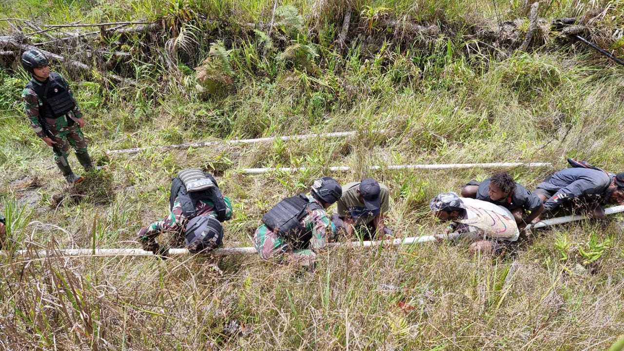 PAPUA – Satgas Mobile Raider 300 Siliwangi yang berada di wilayah Kabupaten Puncak, Papua, memberikan bantuan pipanisasi air kepada warga Kampung Tuangi dalam rangka memenuhi kebutuhan air bersih.