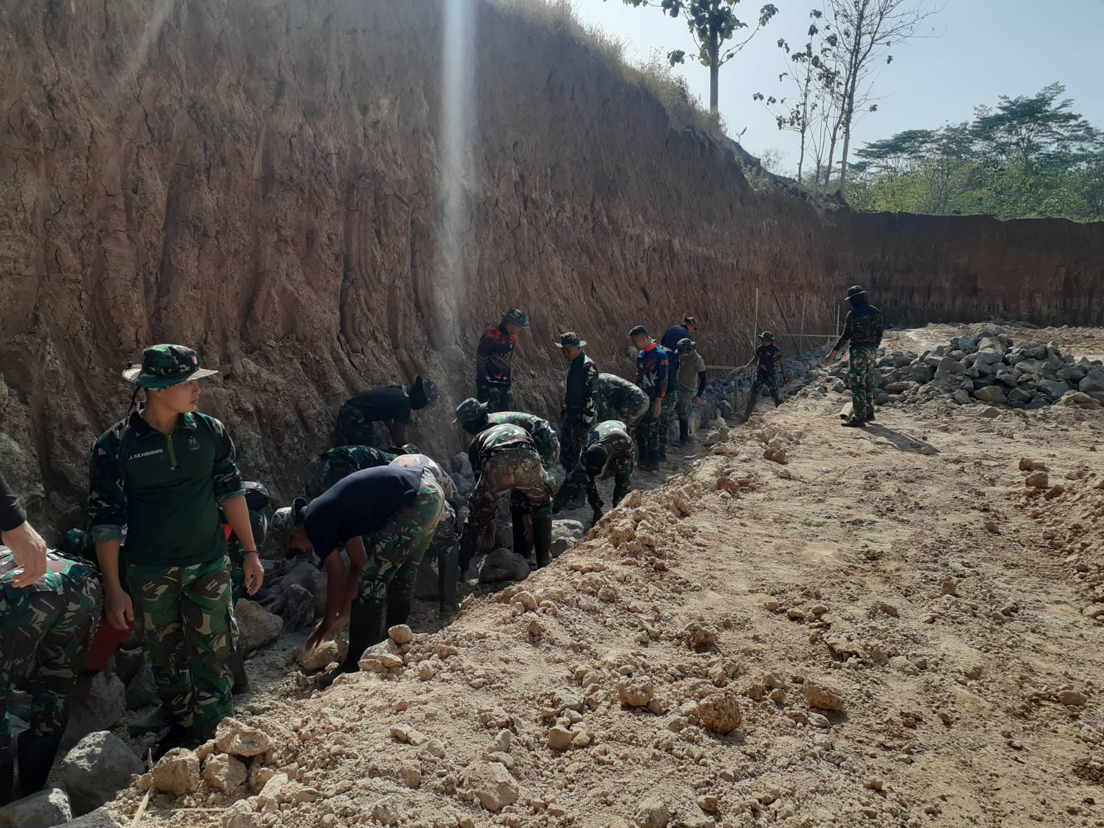 Seperti terlihat, tanpa mengenal lelah, Prajurit TNI bersama warga bahu membahu dalam pembuatan Talud dengan volume panjang 251 m × lebar 3 m × tinggi 0.30 m, yang merupakan salah satu sasaran Fisik TMMD.