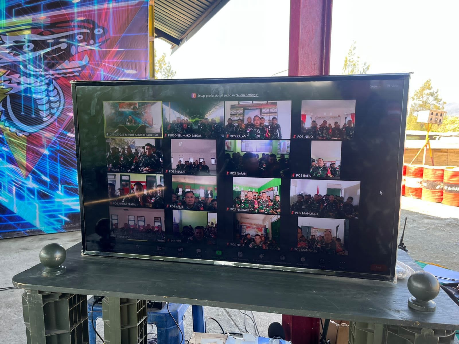 Selain mengunjungi pos secara langsung, Dansatgas adakan video conference untuk mengajak jajaran pos yang ada di Satgas Pamtas RI RDTL Sektor Barat untuk saling bertukar pikiran melalui jalur daring mengenai perkembangan yang ada di masing-masing daerah.