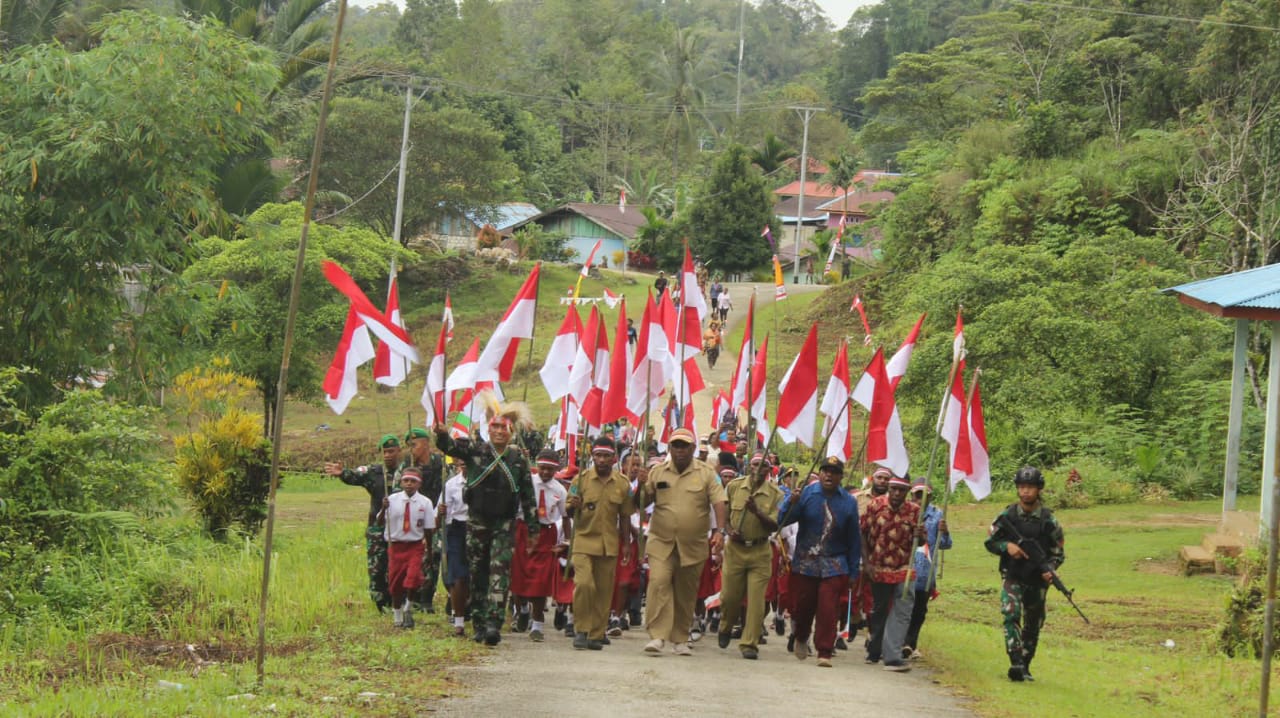 MAYBRAT – Satgas 623/Bhakti Wira Utama bersama Masyarakat, Pelajar, dan PNS dalam menyambut Kemerdekaan Republik Indonesia yang ke-78 di Papua Barat meluncurkan banyak program. Salah satunya pembentangan bendera merah putih raksasa di wilayah Kampung Kokas, Distrik Aifat Utara, Kabupaten Maybrat, Provinsi Papua Barat Daya.