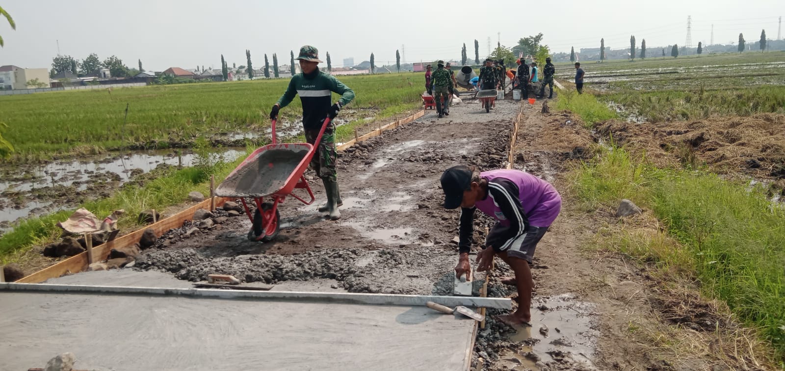 Tampak anggota TNI-Pori serta masyarakat guyub rukun bergotong royong menyelesaikan sasaran fisik tersebut agar selesai tepat waktu. Meski di bawah panasnya terik matahari tidak mengurangi sedikitpun semangat anggota Satgas dan warga ramai-ramai mengerjakan tahap demi tahap pengecoran jalan yang berlokasi di tengah persawahan Desa Wirun, Kecamatan Mojolaban, Kabupaten Sukoharjo tersebut.