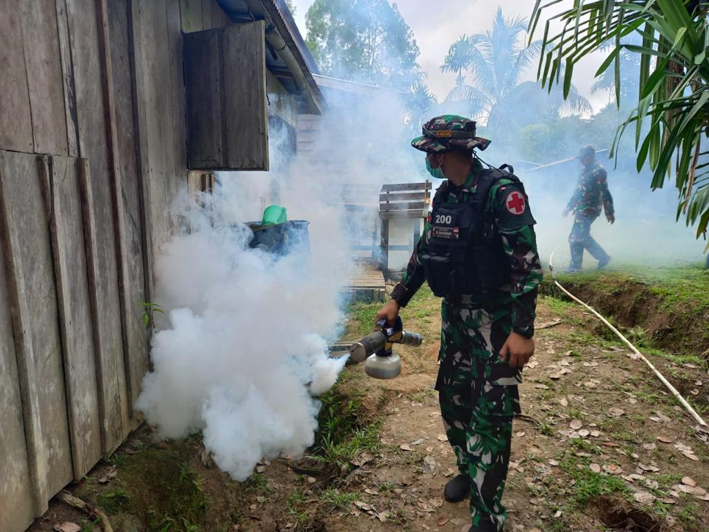 JAYAPURA – Sebagai upaya pencegahan dini terhadap penyebaran penyakit malaria, Satgas Yonif Raider 200/BN Pos Muara Nawa melaksanakan pengasapan (fogging) di Kampung Hulu Atas, Distrik Airu, Kabupaten Jayapura, Papua, pada Selasa (27/6/2023).