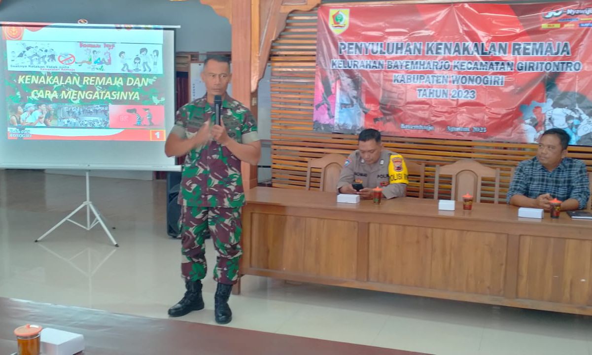 Minggu(17/9/23), dalam rangka mencegah terjadinya kenakalan remaja, bertempat di Balai Kelurahan Bayemharjo, Kecamatan Giritontro, BatiTuud Koramil 09/Giritontro Pelda Paryatmo, berkesempatan memberikan penyuluhan Kenakalan Remaja, bersama dengan anggota Polsek Bripka Rachmat dan Ketua PKK Kelurahan Bayemharjo, yang juga dihadiri oleh Kepala Kelurahan Bayemharjo Agustinus Wijayanto dan Bidan Desa ibu Titin.
