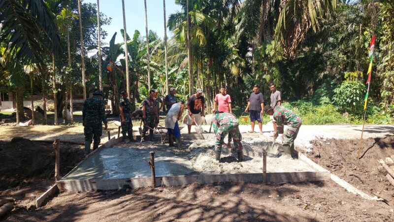 Dengan semangat yang tak pernah luntur, personel TNI dan masyarakat sekitar bergotong royong memperkuat akses jalan desa. Beton dicurahkan, harapan dipancangkan. Di tengah kerja fisik yang berat, terbit kebersamaan yang hangat. Inilah bentuk kemanunggalan sejati—bukan hanya slogan, tetapi nyata dalam tindakan.