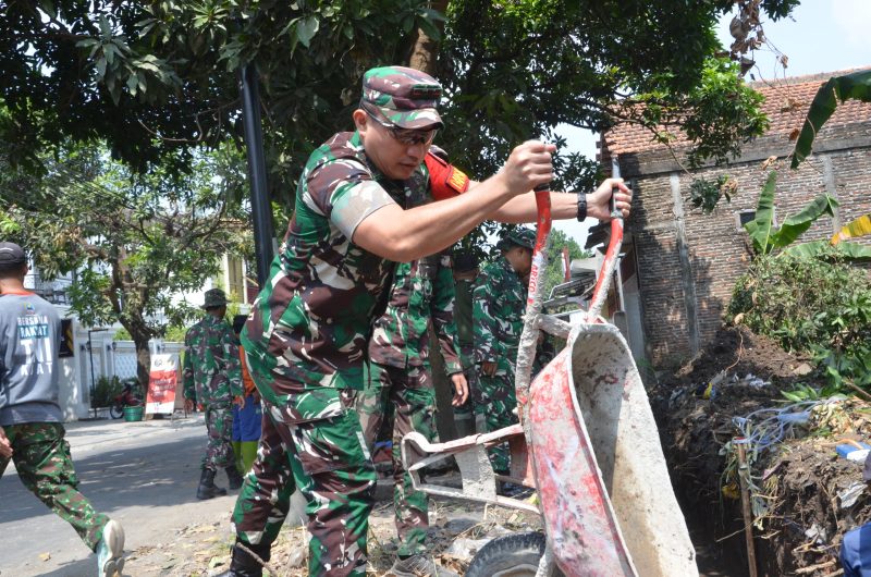Dengan semangat gotong royong, Dansatgas ikut memasukkan material ke dalam mesin molen dan mendorong adukan semen menggunakan angkong, membantu pengerjaan perbaikan saluran air sepanjang 586 meter di Jalan Mojo. Keterlibatan langsung ini bukan hanya simbolis, tetapi menunjukkan komitmen kuat bahwa TNI hadir bukan untuk memerintah, melainkan bekerja bersama rakyat.
