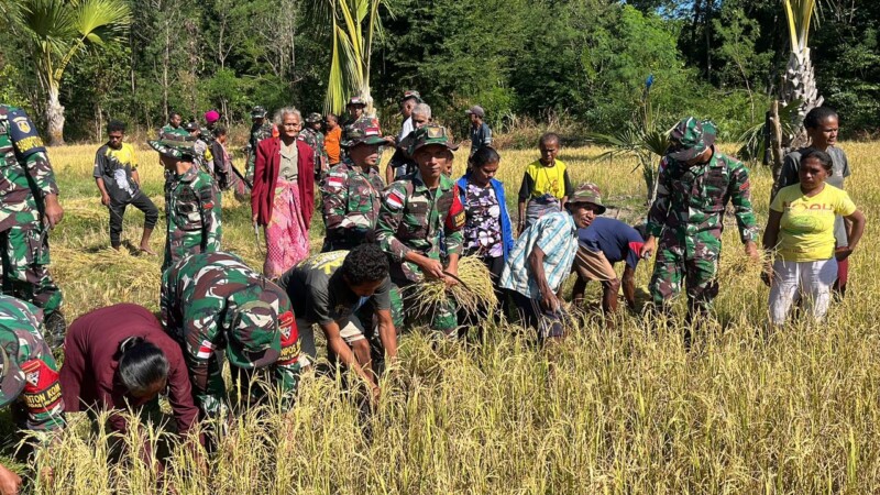 Netemnanu, – Tingkatkan ketahanan pangan daerah perbatasan, Dansatgas Yonkav 6/Naga Karimata Letkol Kav Ronald Tampubolon, S.H., M.Han. laksanakan panen padi bersama masyarakat di Desa Netemnanu, Kecamatan Amfoang, Kabupaten Kupang, Provinsi Nusa Tenggara Timur, Rabu (19/6/2024).