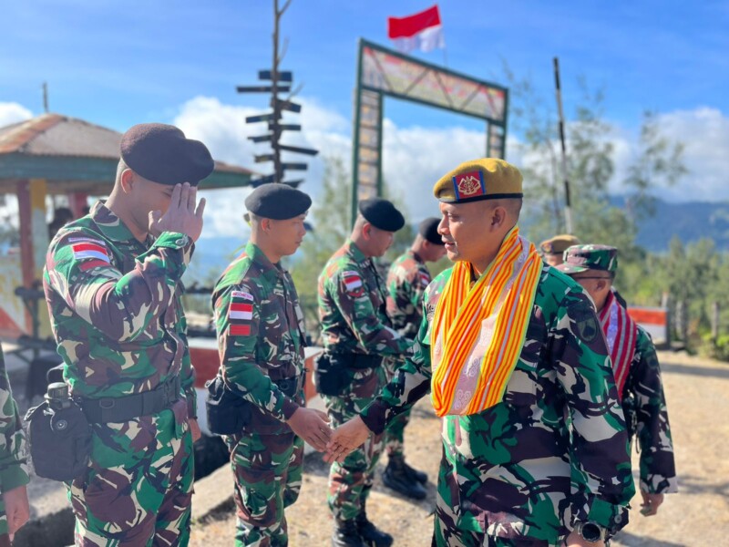 NTT, – Danyon Arhanud 15/Dahana Bhaladika Yudha Letkol Arh Reindi Trisetyo Nugroho bersama Dansatgas Yonkav 6/Naga Karimata Letkol Kav Ronald Tampubolon, S.H., M.Han., mengunjungi Pos Jajaran SSK II yang berada di wilayah perbatasan Republik Indonesia dan Republik Demokratik Timor Leste Sektor Barat, Nusa Tenggara Timur, pada Kamis (27/6/2024).