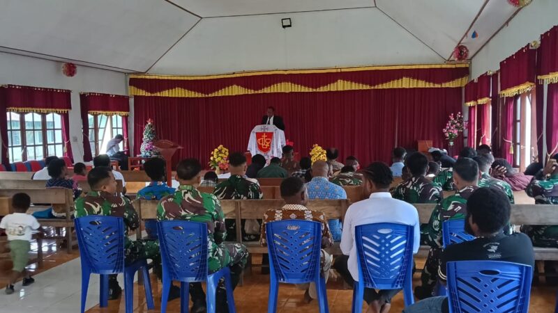 Jayawijaya, – Di balik pegunungan yang sunyi dan langit pagi yang biru pucat, suasana hangat terasa mengalir dari dalam Gereja GKI Jemaat Damai, Kampung Bolakme, Distrik Bolakme, Kabupaten Jayawijaya, Papua Pegunungan, Minggu (11/5/2025). Suara nyanyian pujian terdengar merdu, bersahut-sahutan dengan suara doa yang khusyuk. Di antara para jemaat yang duduk berdoa, tampak barisan prajurit berbaret hijau dari Satgas Yonif 641/Bru Pos Bolakme. Mereka tidak datang dengan senjata, tetapi membawa hati yang terbuka, menyatu dalam ibadah yang penuh haru.