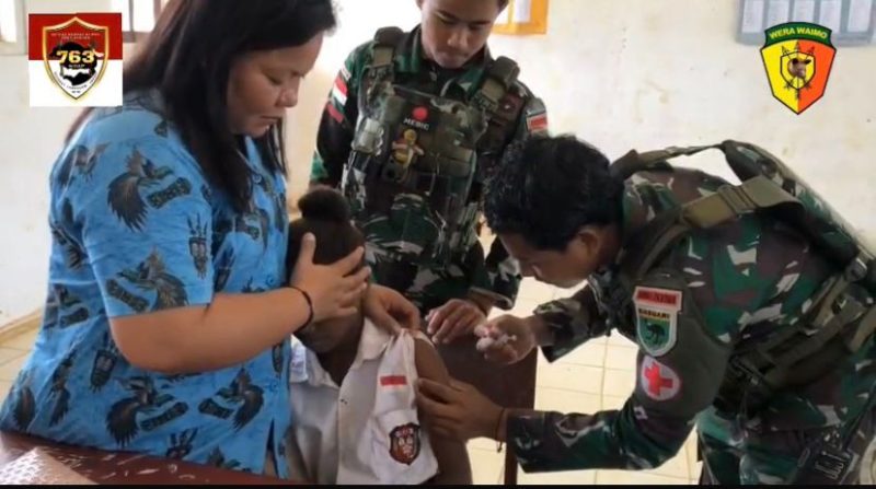 Maybrat, – Pemandangan unik terlihat di Kampung Bori, Distrik Aifat, Kabupaten Maybrat, Jumat (12/9/2025). Prajurit Satgas Yonif 763/SBA dari Pos Bori tak hanya berseragam loreng menjaga keamanan, tetapi juga ikut menjadi “dokter dadakan” demi mendukung kegiatan imunisasi Bulan Imunisasi Anak Sekolah (BIAS).