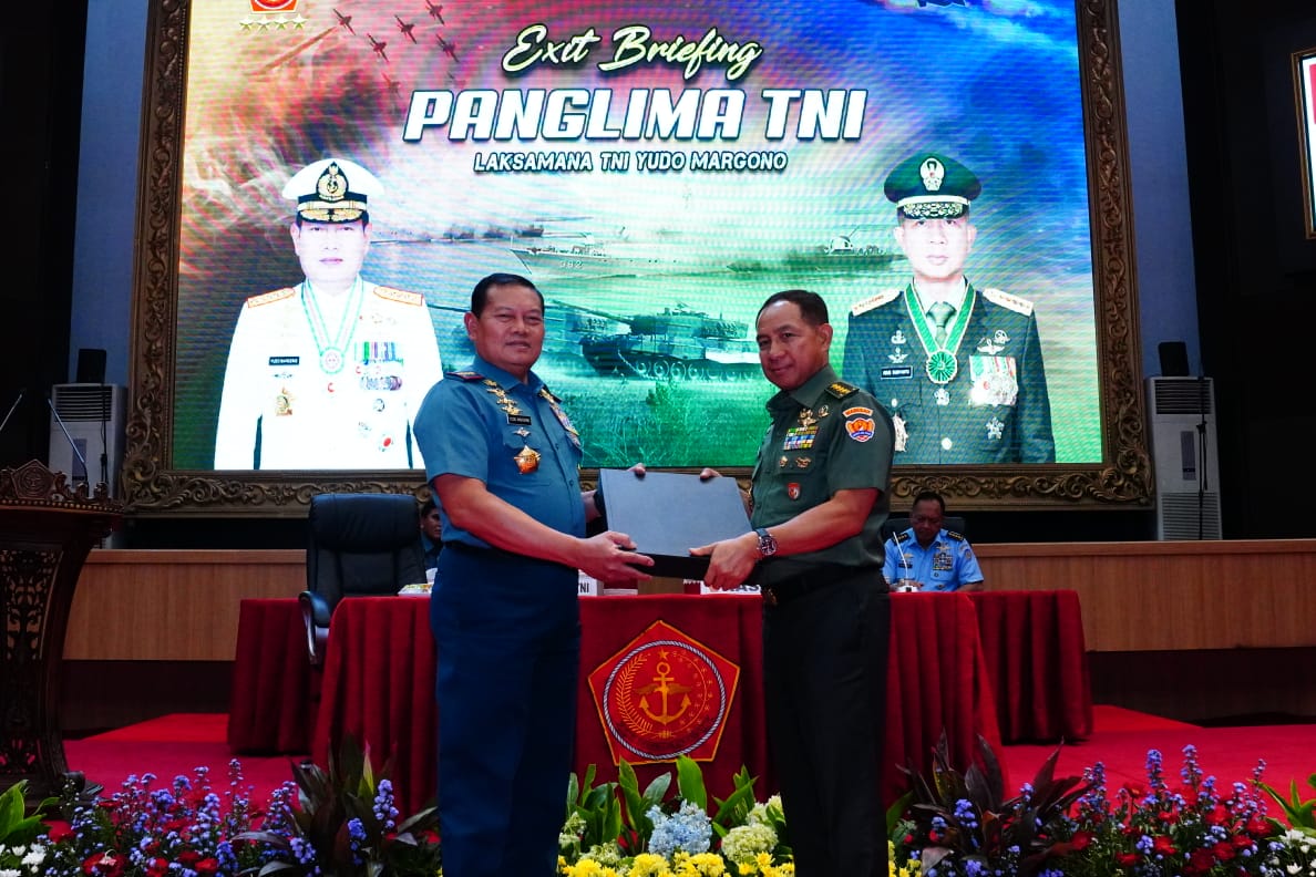 JAKARTA – Di penghujung jabatannya sebagai Panglima TNI, Laksamana TNI Yudo Margono, S.E., M.M., melakukan Exit Briefing atau berpamitan kepada seluruh prajuritnya, sekaligus menyerahkan memorandum dan penyerahan data aset Unit Organisasi (UO) Mabes TNI kepada calon pejabat baru Jenderal TNI Agus Subianto. Hal ini dilaksanakan di Aula Gatot Soebroto Mabes TNI Cilangkap, Jakarta Timur, Senin (20/11/2023).