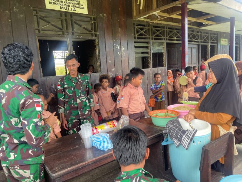 Teluk Bintuni, – Pagi yang cerah di SDN Kalitami, Distrik Kamundan, Papua Barat, membawa suasana berbeda. Deretan bangku panjang telah tersusun rapi, panci-panci besar mengepul, dan aroma masakan memenuhi udara. Namun yang paling terasa bukanlah sekadar harum makanan, melainkan hangatnya kepedulian yang datang dari para prajurit TNI.