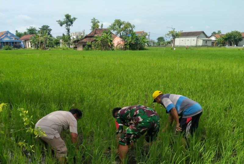 Tulungagung, – Babinsa Desa Waung Sertu Feri Indra Rizki dari Koramil Tipe B 0807/02 Boyolangu terus menunjukkan komitmennya dalam mendukung peningkatan produksi pertanian dengan membantu anggota Kelompok Tani Ngudi Mulya membersihkan gulma atau rumput liar di area persawahan Desa Waung, Kecamatan Boyolangu, Kabupaten Tulungagung, Sabtu (22/11/2025).