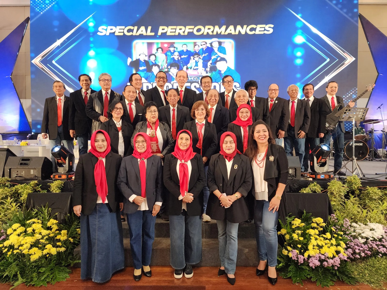 Surabaya, – Jika mendengar kata profesor, barangkali yang muncul dalam benak adalah gelar yang berhubungan dengan penelitian, pengajaran, dan pengabdian. Namun, siapa sangka bahwa sang profesor juga bisa memiliki kepiawaian dalam menciptakan karya seni. Seperti halnya D’Professor, sebuah band yang beranggotakan 41 guru besar asal Universitas Airlangga (Unair) ini.