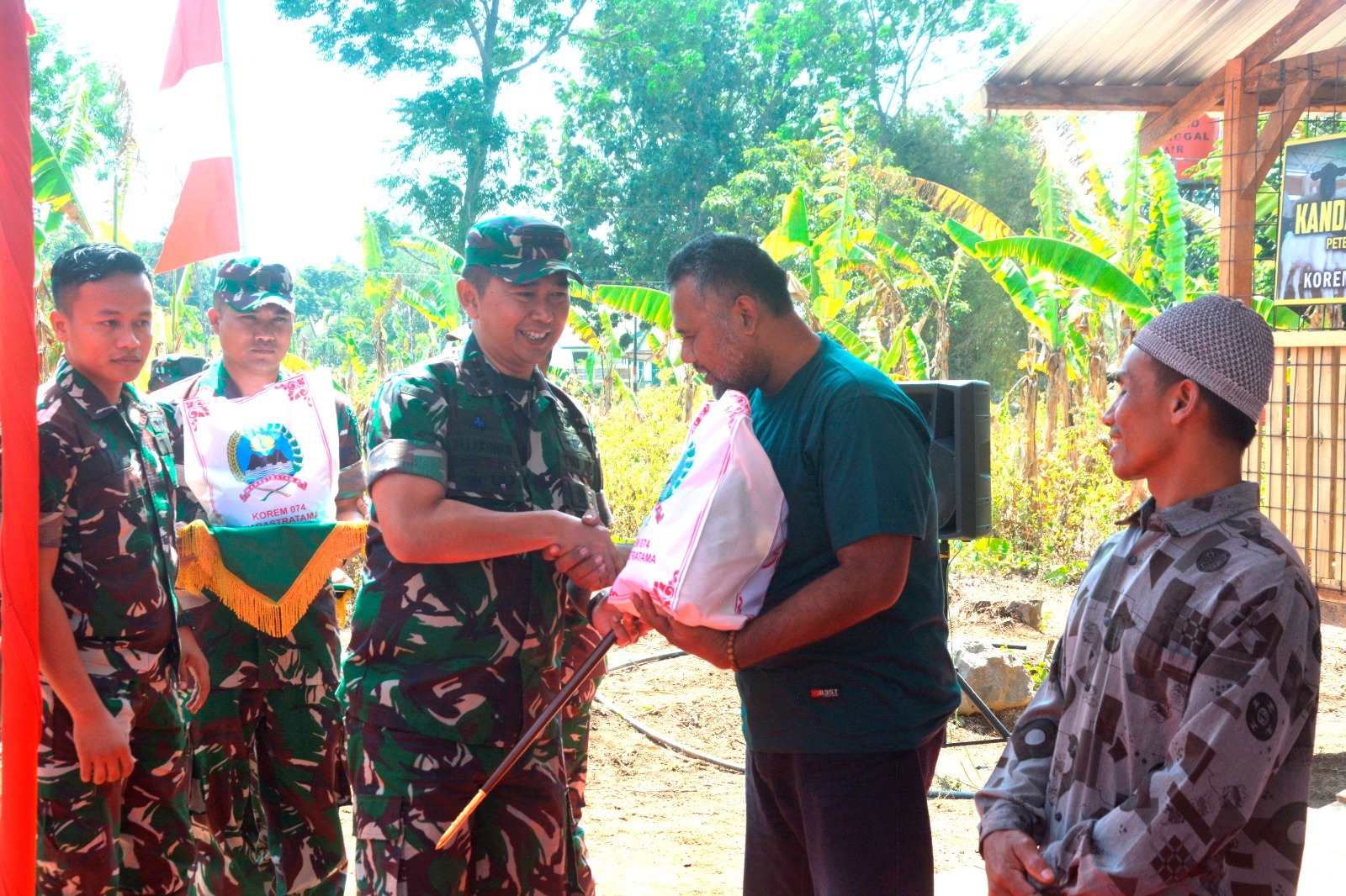 Selesai meresmikan Kandang Domba, Kolonel Inf Ali Akwan, SE menyerahkan paket sembako kepada warga sekitar.