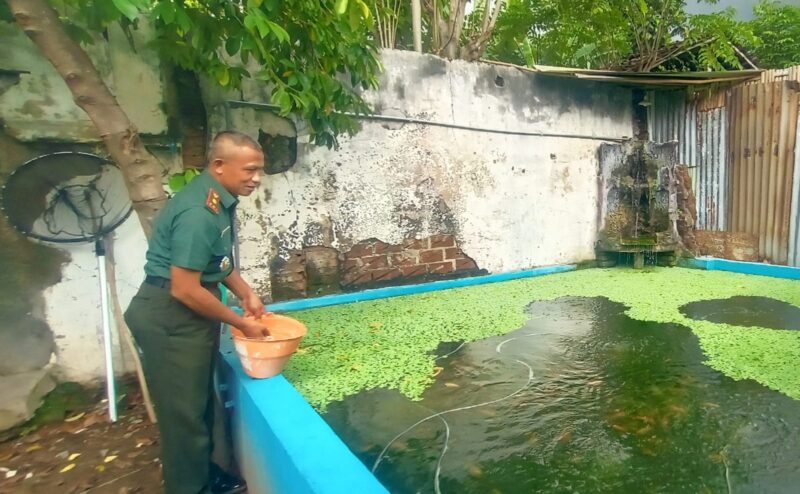 “Denhub ini luas di belakang, makanya saya punya ide untuk memanfaatkan, salah satunya untuk budidaya ayam. Kemudian di sebelah juga ada (budidaya) ikan gurame dan nila,” kata Dandenhubrem 081/DSJ, Mayor CKE Samingun usai memberi makan ayam dan ikan di kantornya, Jl. Kemiri No.12, Taman, Kota Madiun, Kamis (27/2/2025).