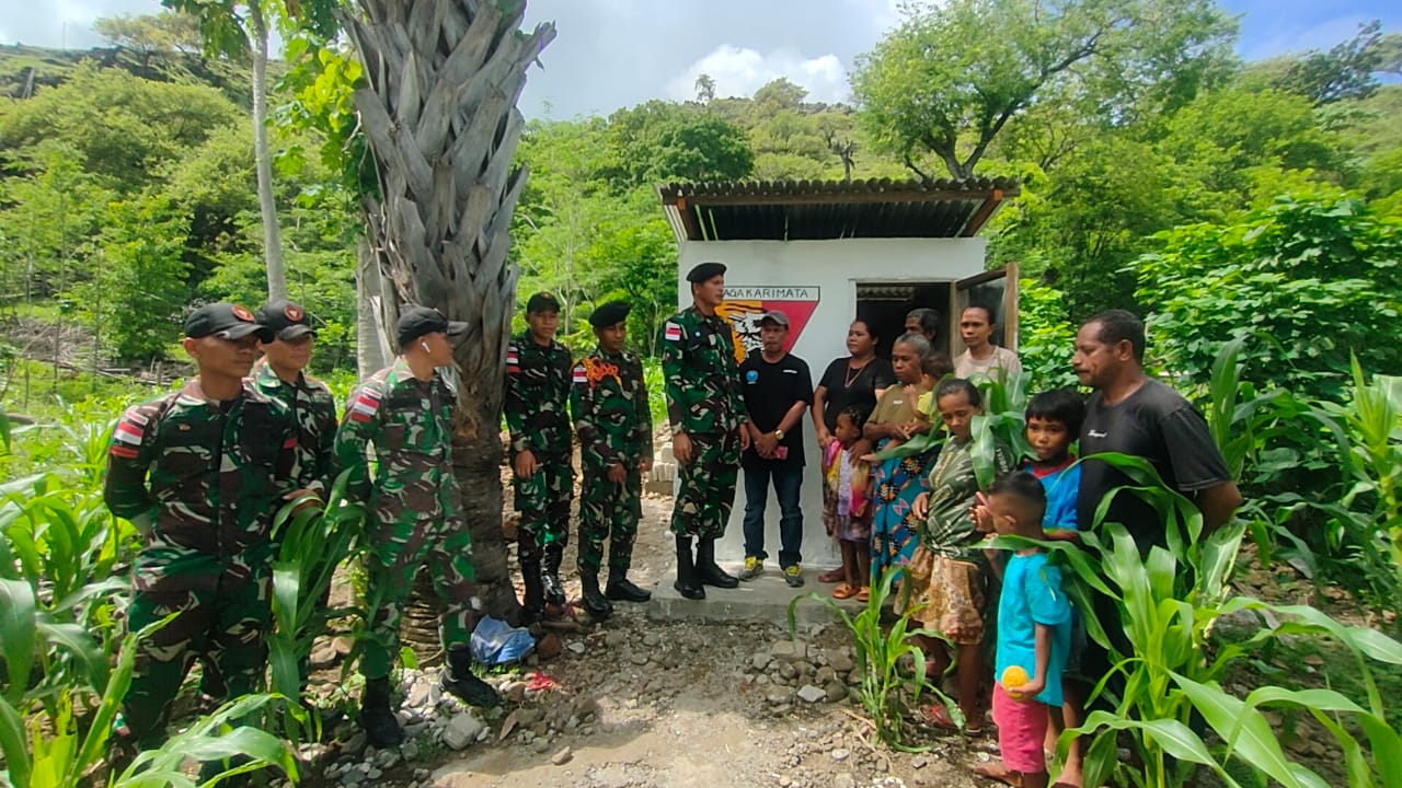TTU – Tuntas membangun MCK untuk masyarakat perbatasan, Dan SSK III Kapten Kav Edianto Simangunsong bersama dengan anggota pos meresmikan MCK yang bersih untuk salah satu masyarakat yakni Petrus Kolo warga Desa Humsu Wini, Kecamatan Insana Utara, Kabupaten Timor Tengah Utara, Provinsi Nusa Tenggara Timur, Jumat (9/2/2024).