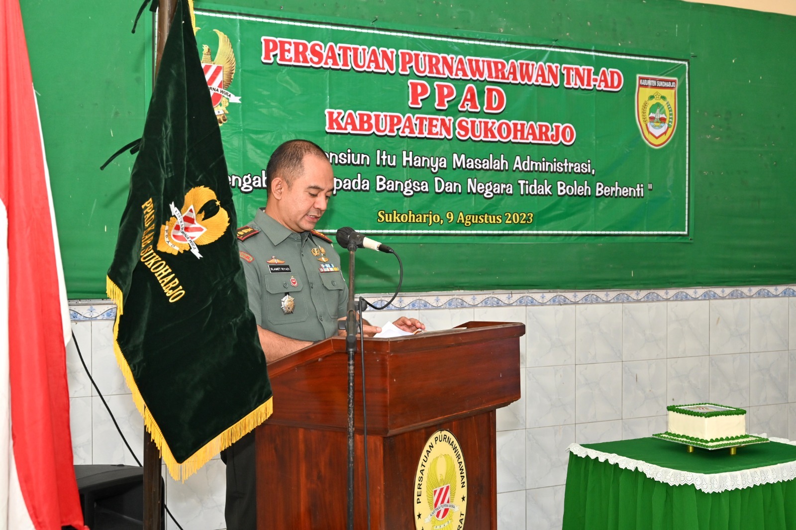 SUKOHARJO – Dandim 0726/Sukoharjo Letkol Czi Slamet Riyadim, S.E menghadiri Peringatan HUT ke 20 Persatuan Purnawirawan TNI AD (PPAD) Tahun 2023 Kab. Sukoharjo dengan tema “Pensiun Itu Hanya Masalah Administrasi, Pengabdian Kepada Bangsa dan Negara Tidak Boleh Berhenti” di kantor DPC PEPABRI Jl. Tentara Pelajar No. 3 Kelurahan Jombor, Kecamatan Bendosari, Kabupaten Sukoharjo, Rabu (9/8/2023).