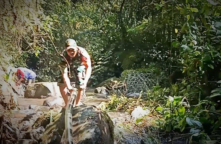 Belasan prajurit TNI pun dikerahkan dalam pengerjaannya. Bersama masyarakat, mereka saling bergotong-royong membelah lebatnya hutan pinus di sana.