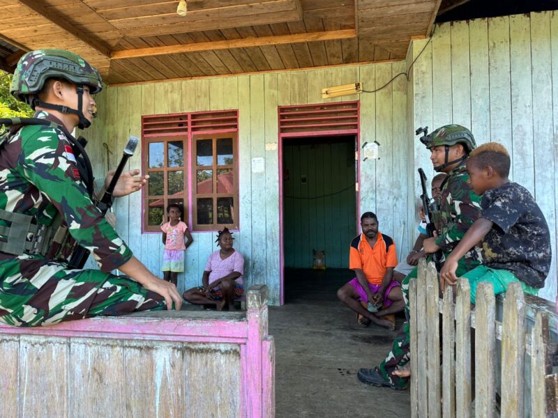 Teluk Bintuni, – Suasana hangat dan penuh keakraban terasa di Kampung Masyeta, Distrik Masyeta, Kabupaten Teluk Bintuni, Provinsi Papua Barat. Anggota Pos Masyeta Satgas Yonif 642/Kps melaksanakan kegiatan komunikasi sosial (komsos) dengan menyambangi rumah-rumah warga, Selasa (1/7/2025).
