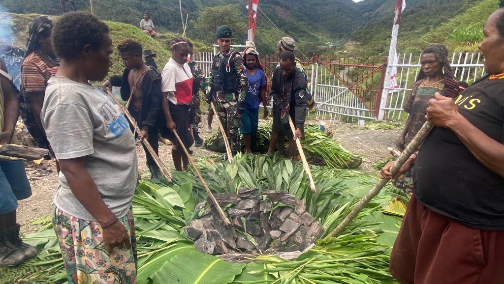 Selama kegiatan perlombaan berlangsung, personil dari Pos Ramil Yambi melaksanakan kegiatan bakar batu bersama masyarakat, dimana kegiatan tersebut merupakan salah satu adat istiadat masyarakat setempat.