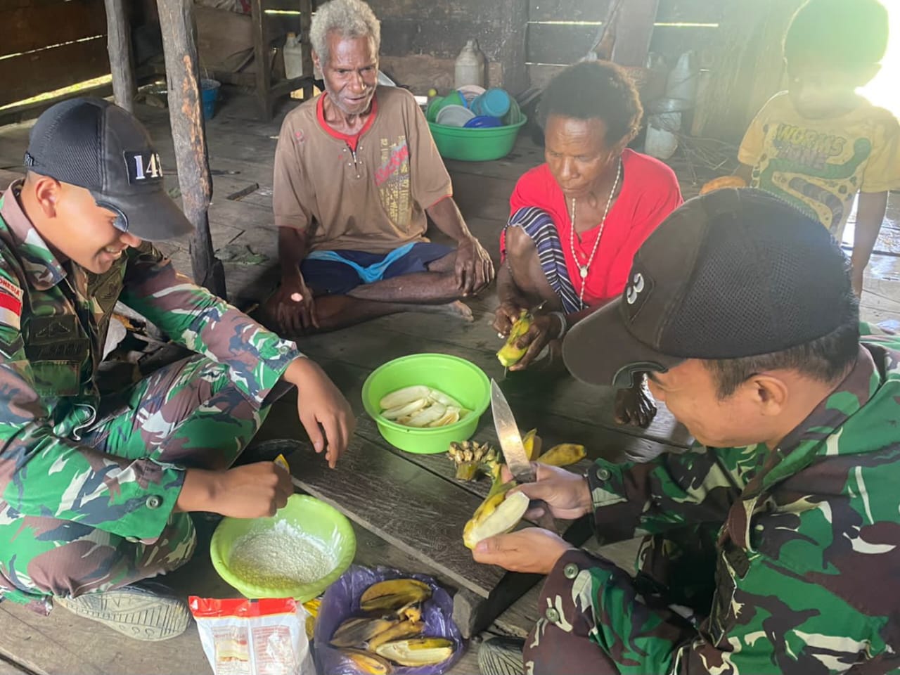 Kegiatan yang dipimpin Sertu Afnan Danpos Ubrub Satgas Yonif 143/TWEJ ini bersama Mama Margaretha Wellip (40) masuk dapur untuk membuat hidangan sederhana pisang goreng sebagai buah meja teman berbincang mereka.