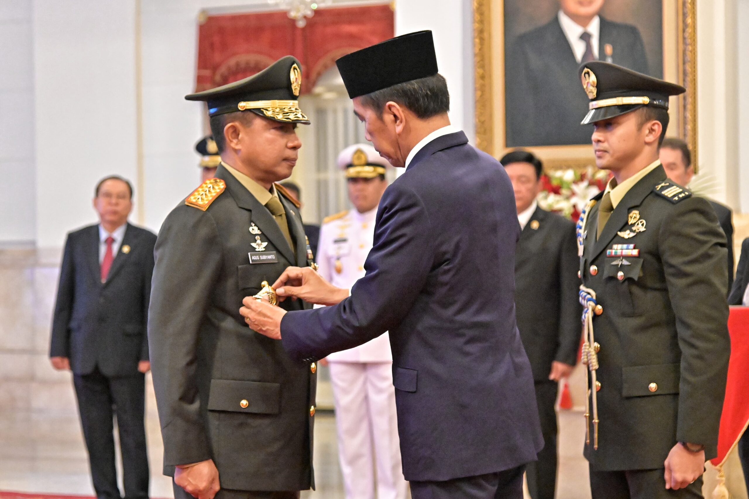 Dalam kesempatan tersebut Presiden Joko Widodo menyematkan tanda pangkat dan menyerahkan tongkat komando kepada Jenderal TNI Agus Subiyanto.