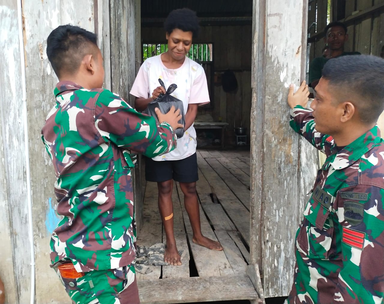 Jayapura, – Personel Satgas Yonif 122/TS melalui Pos Bendungan Tami membagikan sembako kepada masyarakat secara langsung (door to door) bertempat di Kampung Swakarsa, Distrik Muara Tami, Papua, pada Jumat (24/5/2024).