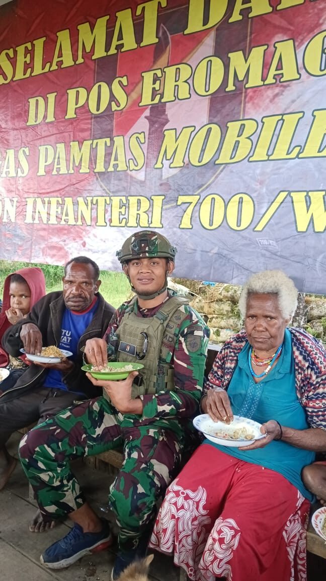 Anak-anak tersenyum ceria, para ibu menyiapkan hidangan sederhana, dan para prajurit bersenda gurau hangat bersama warga. Usai ibadah, mereka duduk bersila menikmati makan siang bersama. Tidak ada sekat antara seragam loreng dan pakaian sederhana warga—yang ada hanyalah keakraban dan penghormatan yang tulus.