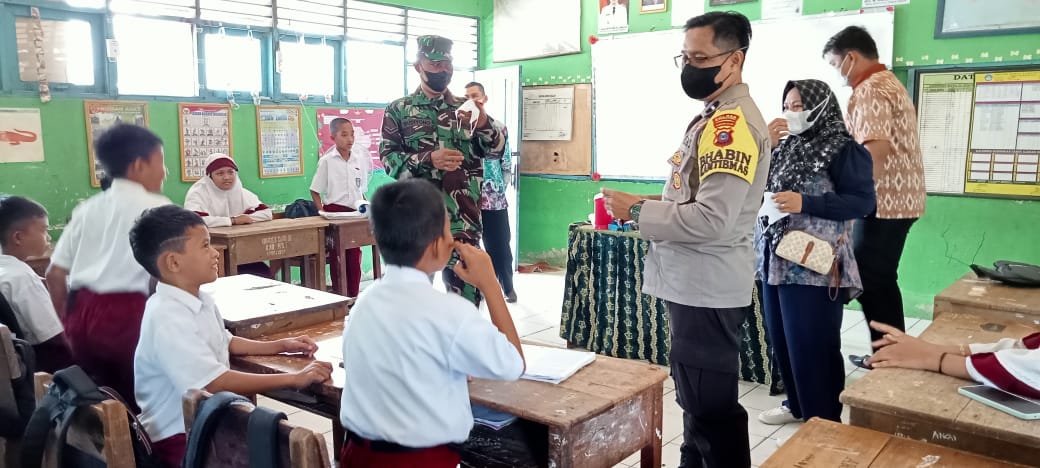 BARABAI – Babinsa Kodim 1002/HST Serda Budiono anggota Koramil 1002-06/Barabai bersama dengan Bhabimkamtibmas bagi-bagi masker gratis di SDN Babai, Kecamatan Barabai, Kabupaten Hulu Sungai Tengah (HST), pada Kamis (5/10/2023).