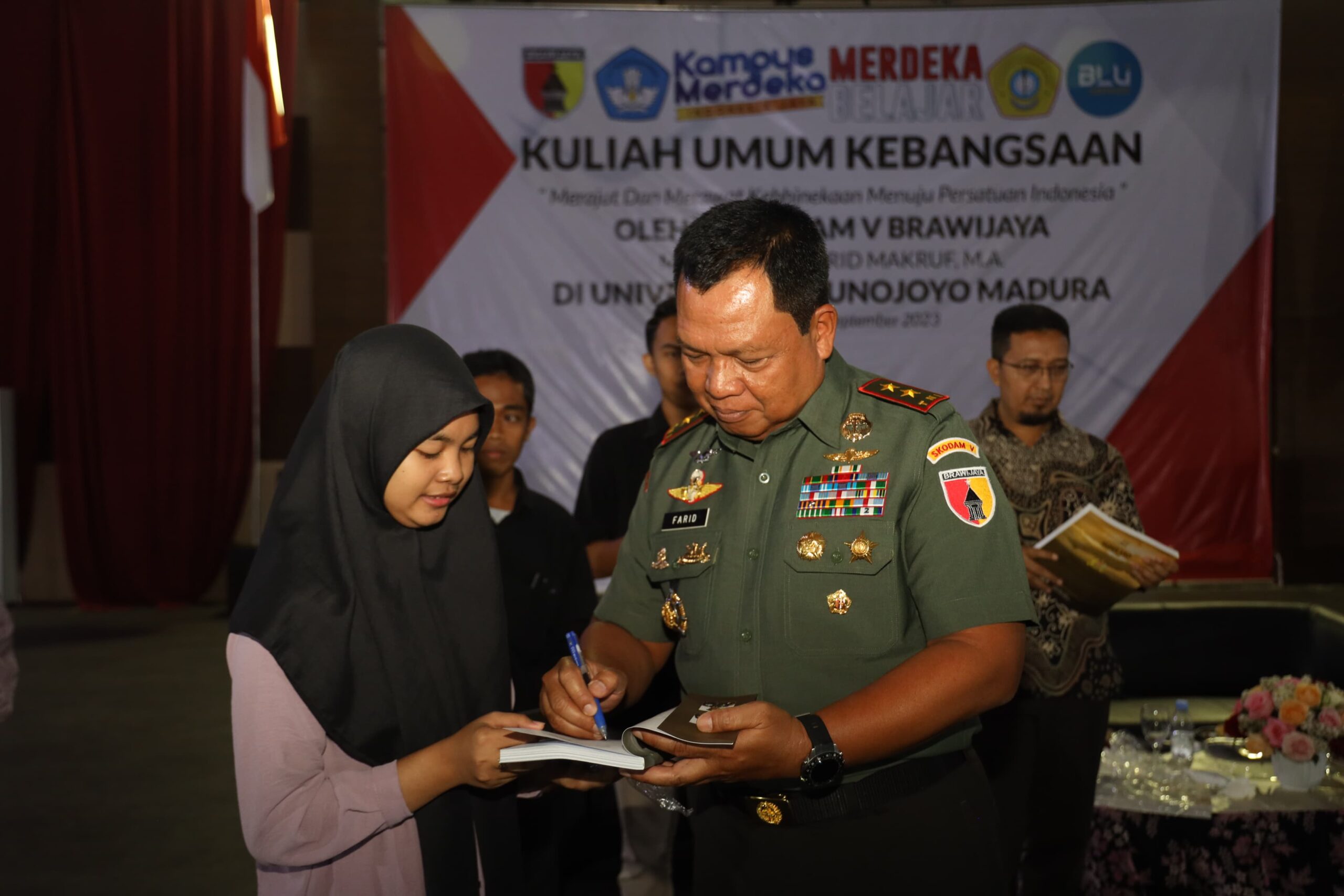 BANGKALAN – Pangdam V/Brawijaya, Mayjen TNI Farid Makruf, M. A, menyempatkan diri untuk memberikan pembekalan di hadapan ribuan mahasiswa Universitas Trunojoyo, Senin (25/9/2023).