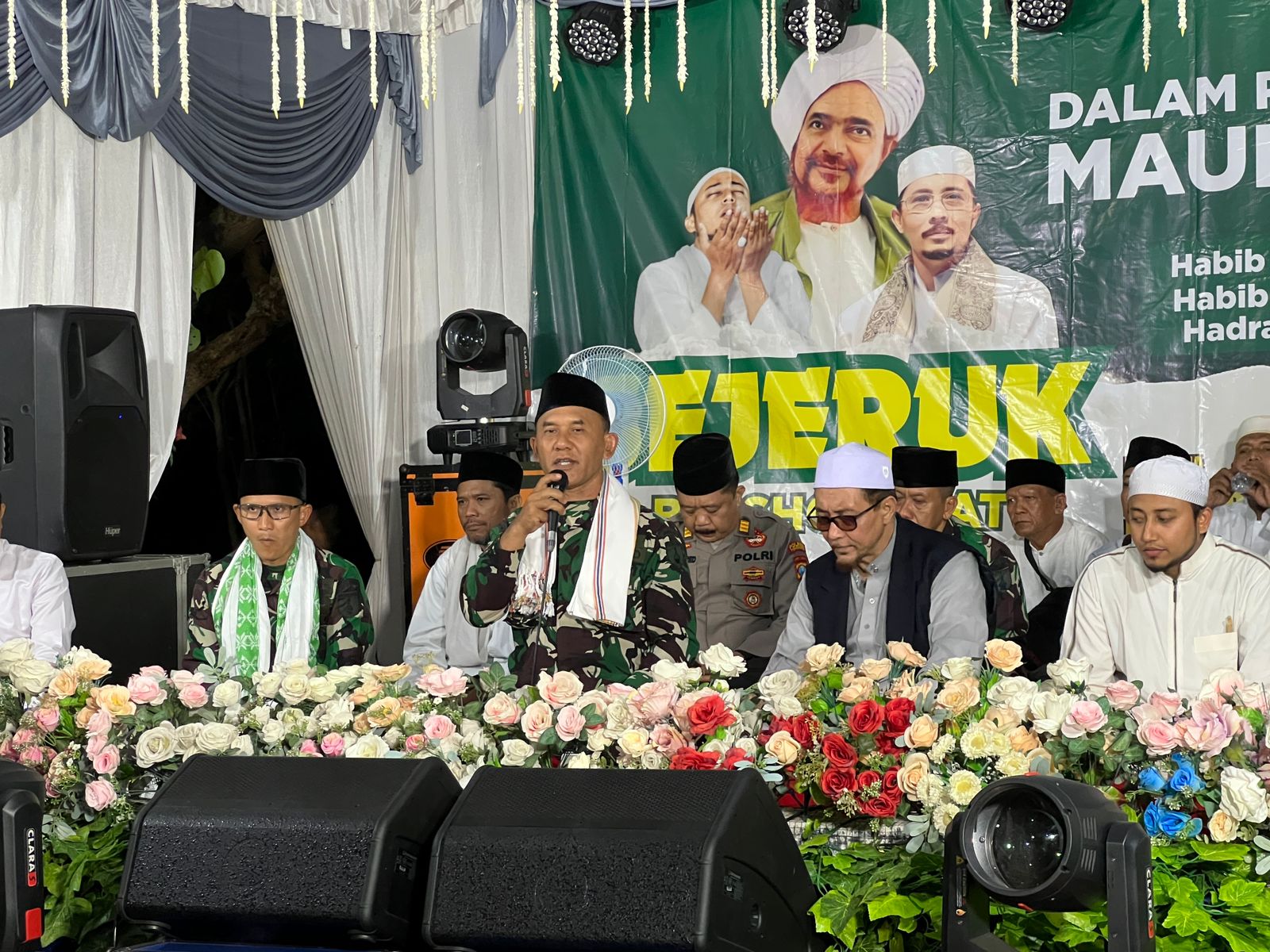 ‘’Selain menjaga keamanan, kami TNI dan Polri adalah aparat yang menjaga keimanan. Sehingga apabila ada undangan bersholawat, selagi tidak ada tugas khusus maka pasti akan datang untuk bergabung bersama aparat penjaga keimanan semuanya,’’ bebernya.
