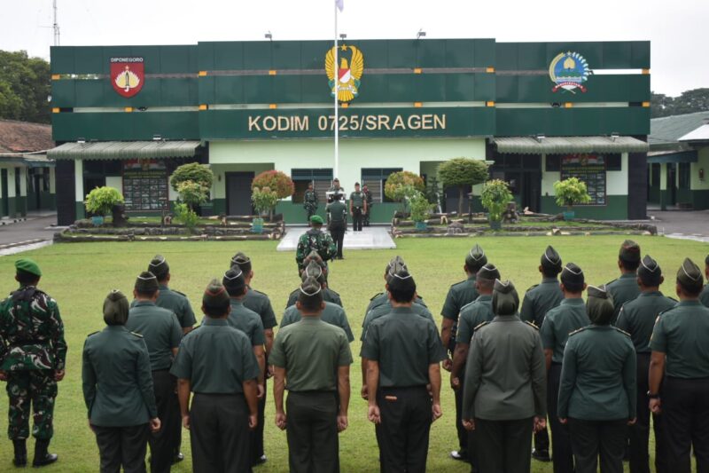 Sragen, – Suasana lapangan Makodim 0725/Sragen di Jalan Raya Sukowati No. 13, Sine, Sragen, tampak penuh warna semangat merah putih, Selasa (28/10/2025). Seluruh prajurit, PNS, Subdenpom, dan Minvet Sragen berdiri tegap mengikuti upacara bendera peringatan Hari Sumpah Pemuda ke-97.