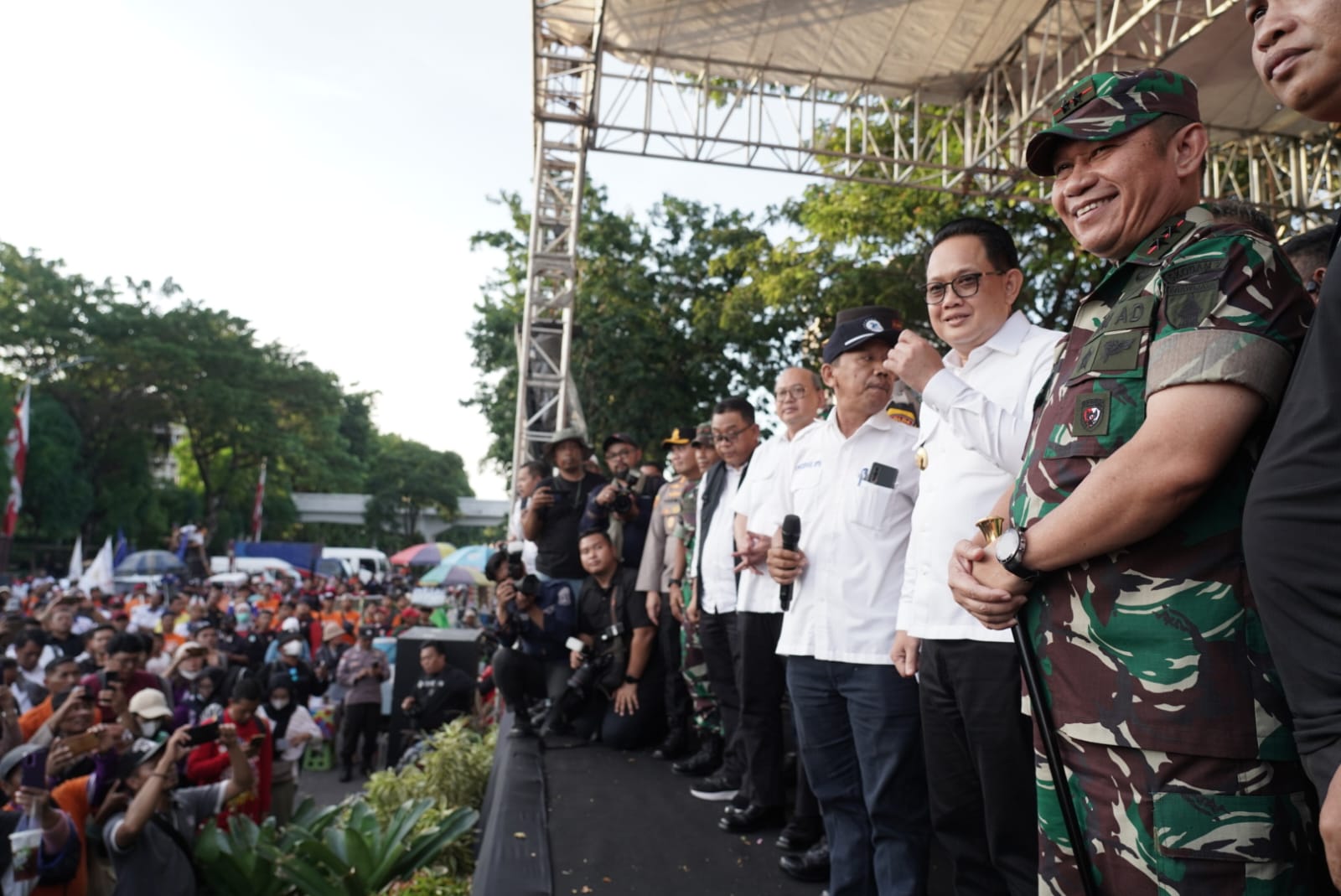 Kehadiran ribuan buruh dari gabungan beberapa organisasi buruh di Jatim itu, disambut langsung oleh Forkopimda Jatim. Diantarnya, Pj Gubernur Jatim, Adhy Karyono, Pangdam V/Brawijaya Mayjen TNI Rafael Granada Baay dan Kapolda Jatim, Irjen Pol Imam Sugianto.