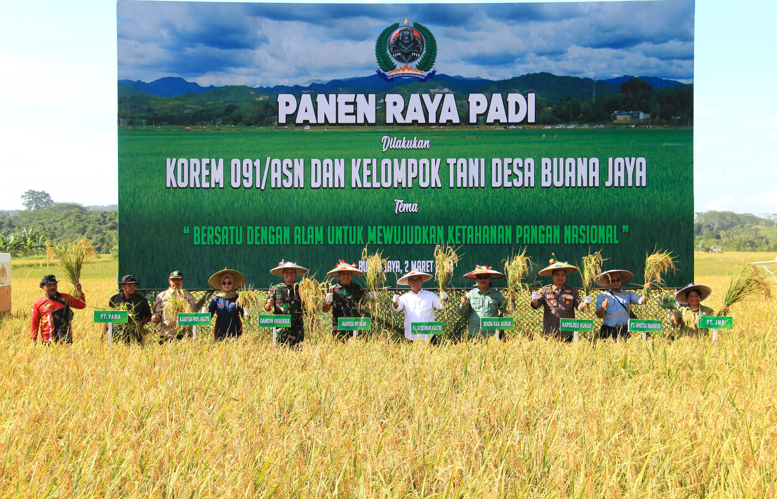 Untuk diketahui, panen raya padi varietas Inpari 32 dan Mikongga yang berlangsung di areal persawahan kelompok tani Desa Buana Jaya tersebut merupakan upaya jajaran Korem 091/Asn beserta Kodim 0906/Kkr dan pemerintah daerah setempat dalam rangka mendukung program ketahanan pangan di tengah-tengah masyarakat, demi terwujudnya ketahanan pangan nasional.
