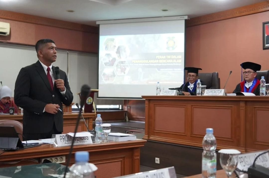 Wakil Rektor I Dr. Eddy Ikhsan SH. MH saat memimpin sidang Program Studi S3 Fakultas Ilmu Sosial dan Ilmu Politik Universitas Sumatera Utara (USU) menyampaikan “Kami para dosen dan mahasiswa Universitas Sumatera Utara sangat bangga sekali dengan keberhasilan seorang Pamen TNI AD Kolonel Inf Agustatius Sitepu meraih gelar Doktor melalui tahap ujian yang berat dengan Disertasi *Penanggulangan Bencana Alam (Gulbacel) Erupsi Gunung Sinabung*”