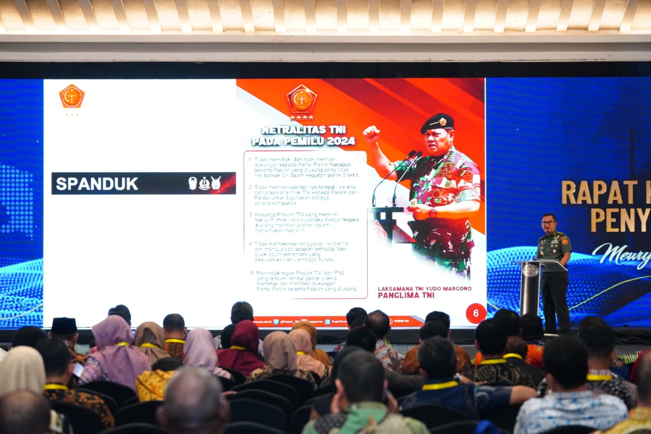 Selanjutnya, Kasum TNI menyampaikan arah kebijakan dan langkah strategis TNI dalam rangka mengamankan Pemilu tahun 2024, dimana TNI akan berperan aktif mengamankan seluruh tahapan Pemilu tahun 2024 dengan langkah-langkah kebijakan : Netralitas TNI dalam Pemilu yang akan datang, dimana hal ini telah diamanatkan di dalam UU Nomor 34 Tahun 2004 tentang TNI pada Pasal 39 yang melarang setiap prajurit TNI untuk menjadi anggota partai politik, mengikuti maupun terlibat dalam kegiatan politik praktis serta dipilih menjadi anggota legislatif dalam Pemilu dan jabatan politis lainnya.