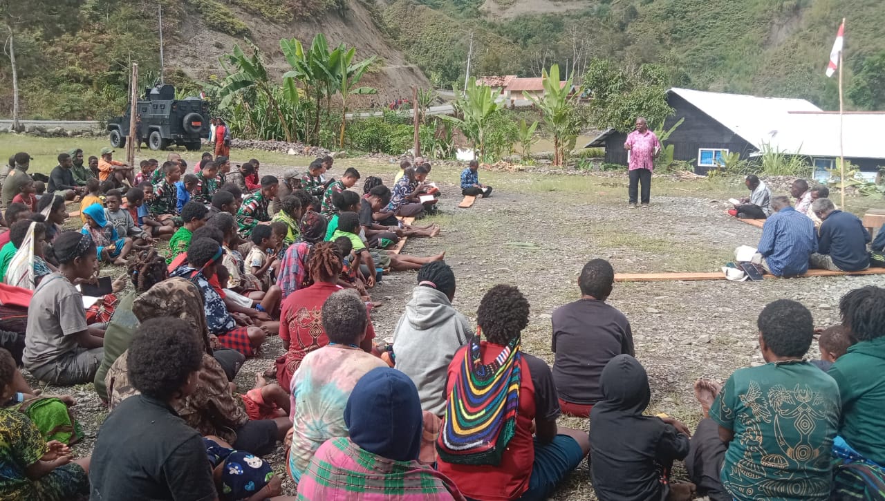 PAPUA – Personil Pos Pintu Angin dan Pos Pruleme Satgas Yonif RK 115/ML yang beragama Kristen sejumlah 12 orang melaksanakan ibadah bersama masyarakat di halaman Gereja GIDI yang berada di Kampung Kulirik, Distrik Mulia, Kabupaten Puncak Jaya, Minggu (27/8/2023).