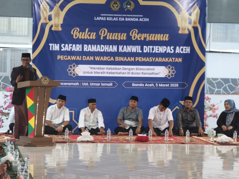 Banda Aceh, – Suasana Ramadhan dimanfaatkan Lembaga Pemasyarakatan (Lapas) Kelas IIA Banda Aceh untuk memperkuat pembinaan kepribadian dan spiritual bagi warga binaan. Selain membagikan perlengkapan ibadah berupa baju koko dan peci, pihak lapas juga menggelar kegiatan buka puasa bersama Tim Safari Ramadhan dari Kantor Wilayah Direktorat Jenderal Pemasyarakatan Aceh, Kamis (5/3/2026).