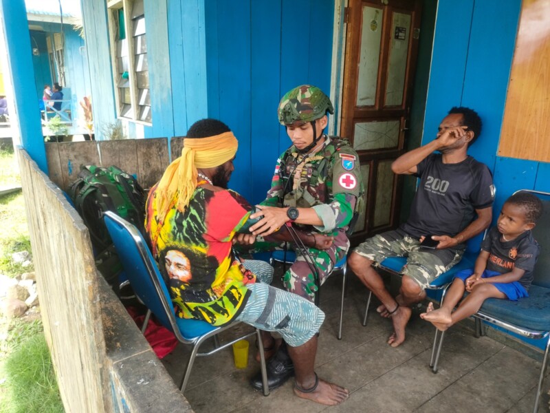 Selain menjalankan tugas pokok menjaga keamanan di wilayah Distrik Kobakma, Satgas Yonif 641/Bru juga memberikan bantuan tenaga kesehatan dengan warga untuk mempererat hubungan baik dengan masyarakat sekitar.
