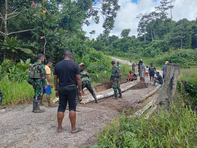 Teluk Bintuni, – Satgas Pamtas RI-PNG Kewilayahan Papua Barat Yonif 642/Kps Pos Meyerga Kampung Meyerga, Kecamatan Moskona Barat, Kabupaten Teluk Bintuni, Provinsi Papua Barat ikut serta memperbaiki jembatan yang roboh akibat longsor yang mengakibatkan terputusnya jalur perlintasan warga Meyerga, pada Senin (19/8/2024).