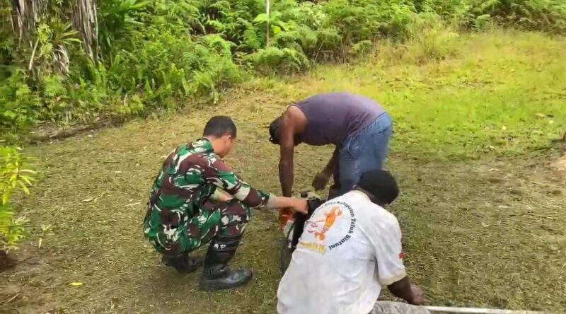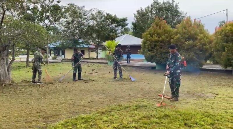 Teluk Bintuni, – Satgas Pamtas Kewilayahan Yonif 642/Kps Pos Jagiro, personil pos bersama masyarakat membersihkan kampung jagiro Kabupaten Teluk Bintuni, Papua Barat. (11/4)