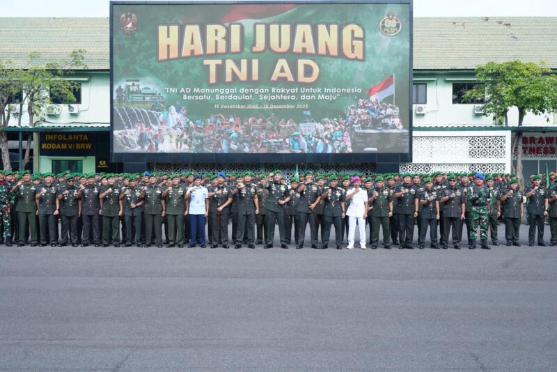 Surabaya, – Pangdam V/Brawijaya Mayjen TNI Rudy Saladin, M.A. memimpin upacara peringatan Hari Juang TNI Angkatan Darat Tahun 2025 di Lapangan Ahmad Yani Makodam V/Brawijaya, Senin (15/12/2025). Kegiatan berlangsung khidmat, mencerminkan semangat pengabdian prajurit kepada bangsa dan negara.