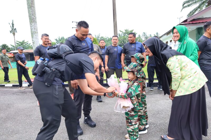 Momen menjadi semakin hangat ketika dua bocah cilik berpakaian militer mini melangkah maju sambil menyerahkan buket bunga kepada Pangdam, simbol penghormatan dan kebanggaan keluarga besar Yonarmed 2/105 KS atas kunjungan pimpinan tertinggi Kodam I/BB.