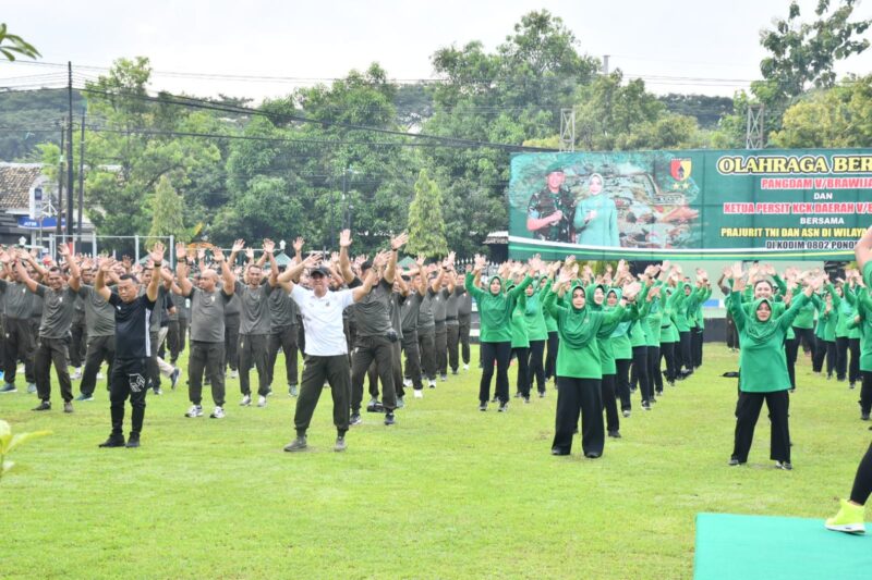 Ponorogo, – Semangat pagi bergema di Markas Kodim 0802/Ponorogo. Musik senam mengalun riang, derap kaki para prajurit berpadu serempak dengan gerakan lincah Persit dan PNS. Di barisan depan, Pangdam V/Brawijaya Mayjen TNI Rudy Saladin bersama sang istri, Ny. Vira Rudy Saladin, memimpin langsung senam aerobik yang menjadi bagian dari kunjungan kerja mereka.