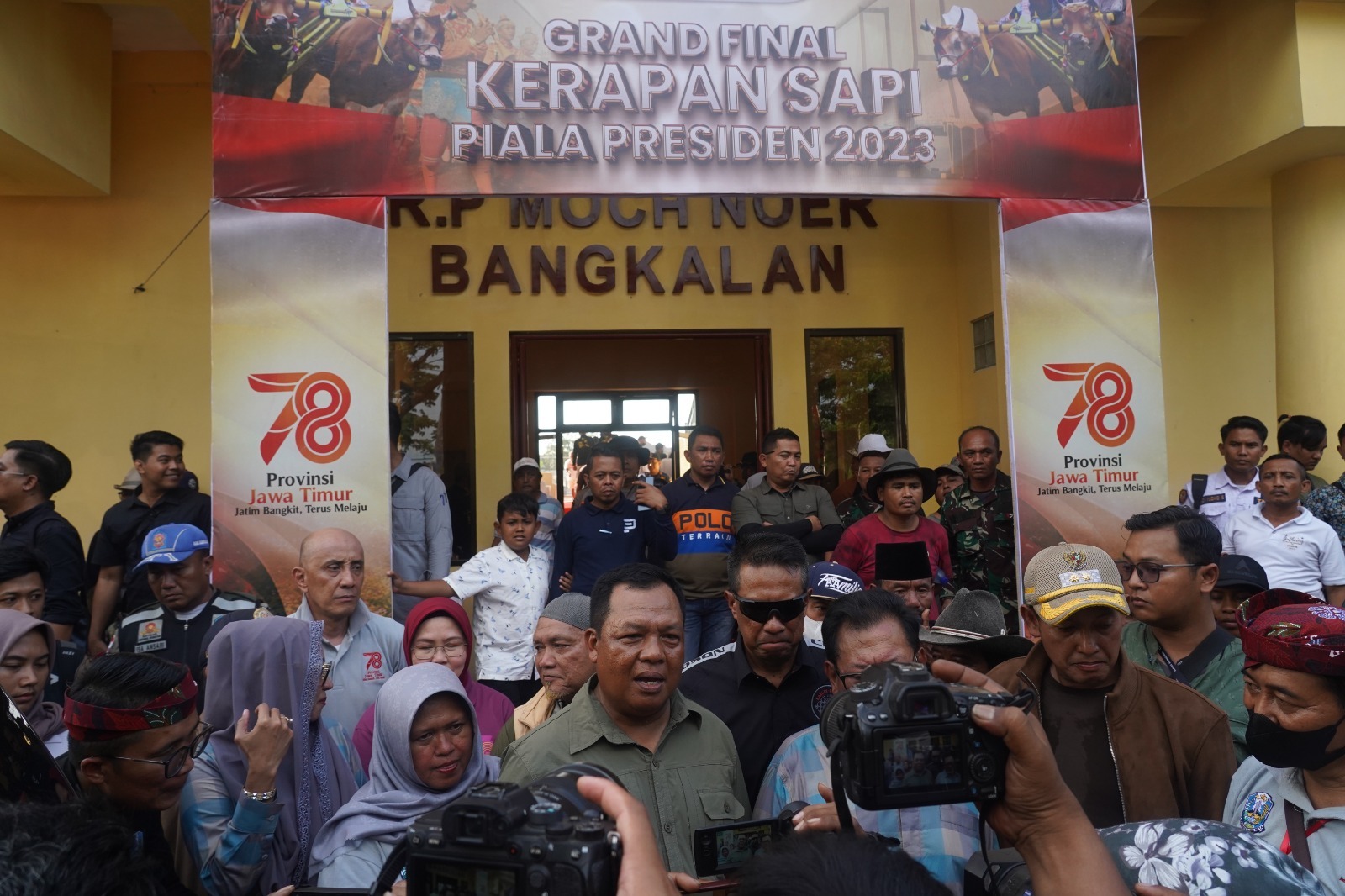 BANGKALAN – Mayor Jenderal Farid Makruf, M.A, turut hadir ditengah tengah kemeriahan di Lapangan Kerapan Sapi Mohamad Noer untuk menyaksikan Grand Final Karapan Sapi Piala Presiden, Bangkalan Madura. Kerapan sapi piala presiden ini merupakan bentuk wujud apresiasi terhadap kekayaan budaya dan tradisi Indonesia yang menjadi kebanggaan warga Pulau Garam.