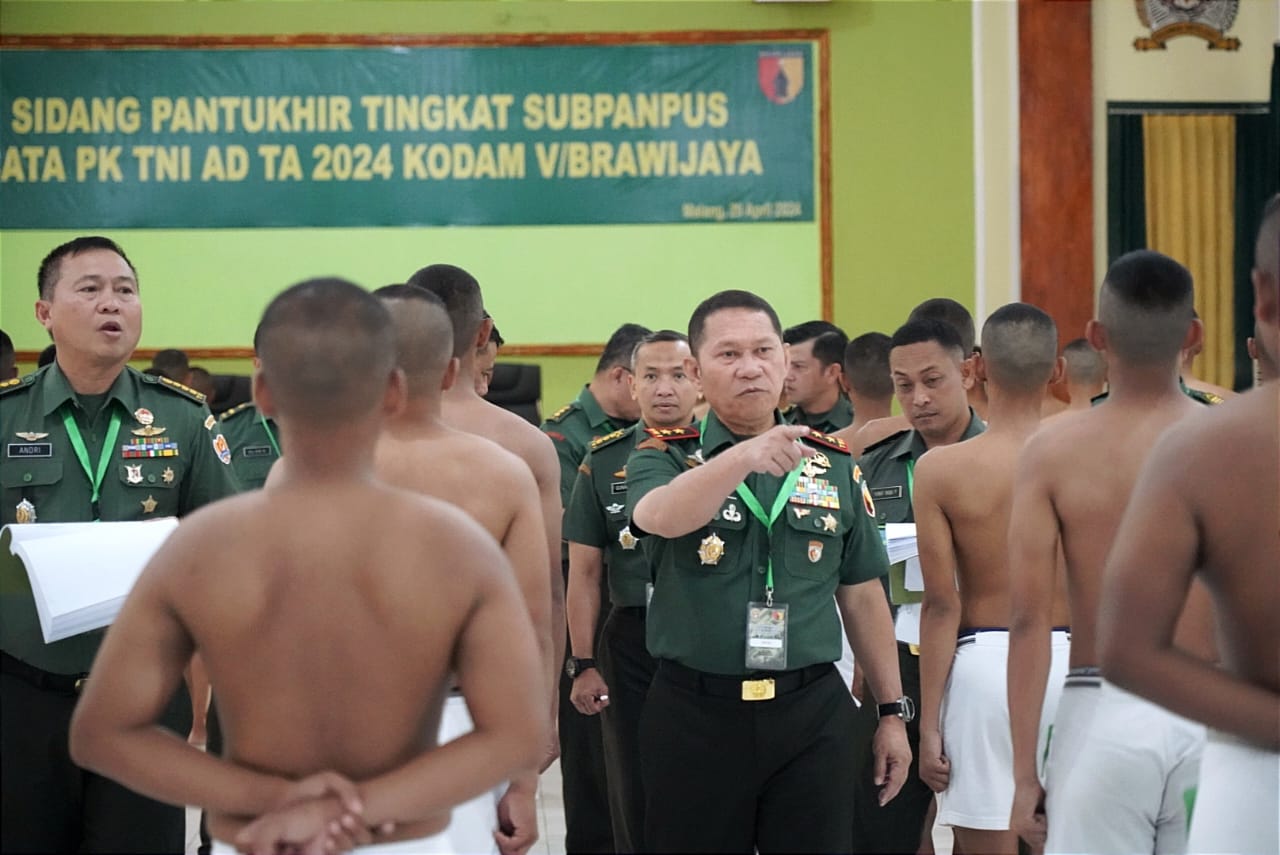 Malang,– Pangdam V/Brawijaya Mayjen TNI Rafael Granada Baay memimpin secara langsung sidang pantukhir Calon Tamtama (cata) TNI-AD 2024 di Dodikjur Rindam V/Brawijaya, Kota Malang, pada hari ini, Senin (29/4/2024).